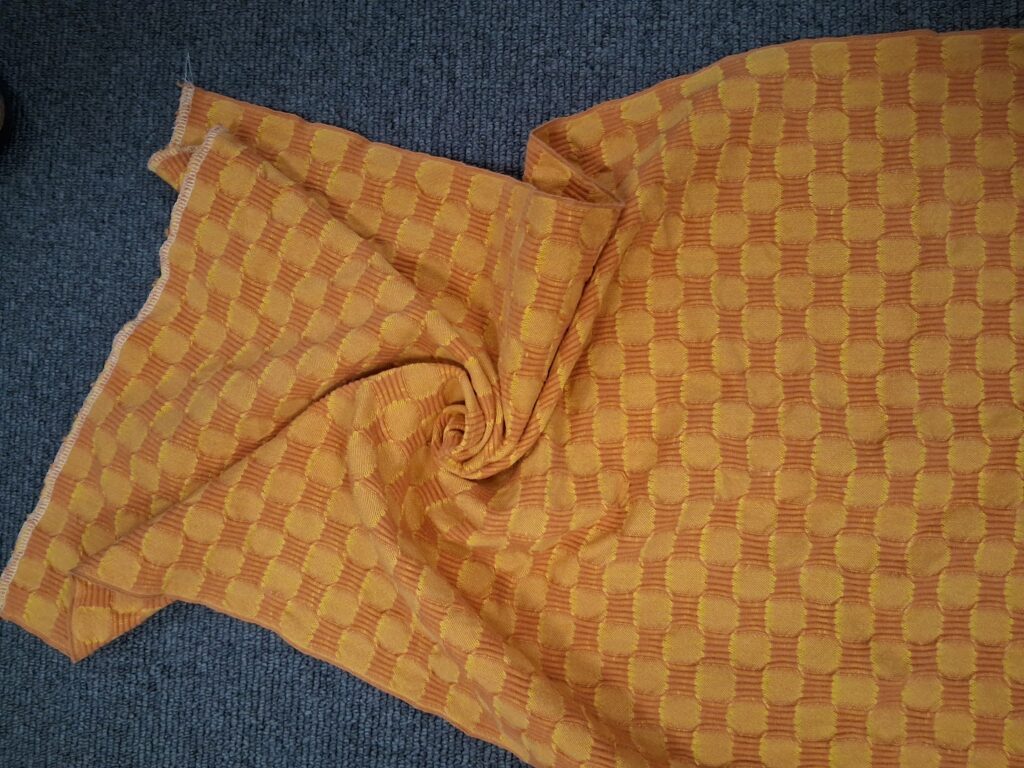 Stoffet er vævet af rester af gode strikkegarner. Den videre rejse for stoffet er endnu ikke besluttet, men det kan omformes til en vest, en taske, kun fantasien og stoffets størrelse sætter grænser.